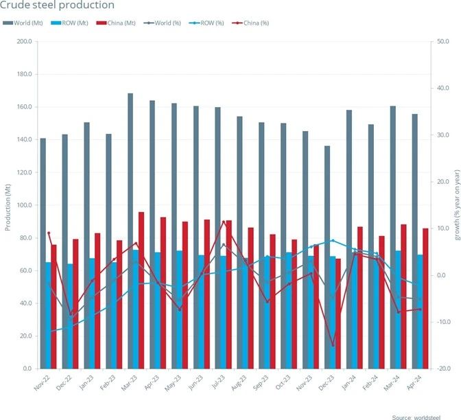 2024年4月全球71個納入世界鋼鐵協會統計國家的粗鋼產量為1.557億噸,同比下降5.0%。