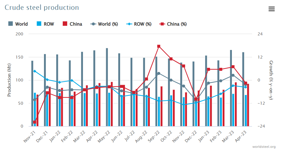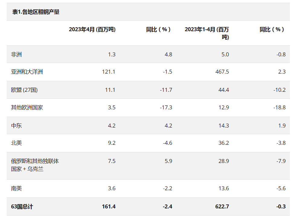 2023年4月全球63個納入世界鋼鐵協會統計國家的粗鋼產量為1.614億噸,同比下降2.4%。