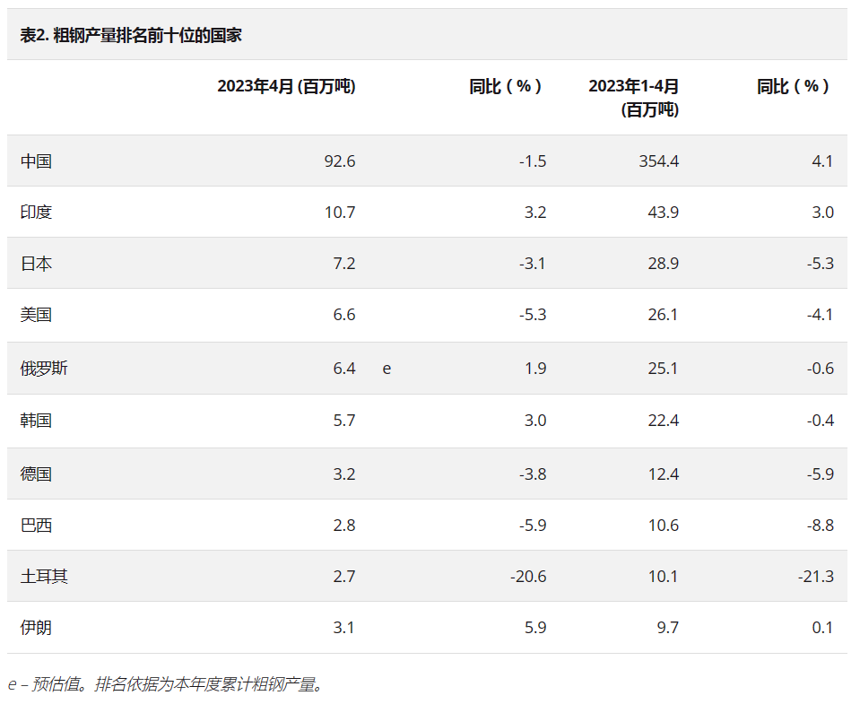 2023年4月,中國粗鋼產量為9264萬噸,同比下降1.5%;印度粗鋼產量為1070萬噸,同比提高3.2%;日本粗鋼產量為720萬噸,同比下降3.1%;美國粗鋼產量為660萬噸,同比下降5.3%;俄羅斯粗鋼預估產量為640萬噸,同比提高1.9%;韓國粗鋼產量為570萬噸,同比提高3.0%;德國粗鋼產量為320萬噸,同比下降3.8%;巴西粗鋼產量為280萬噸,同比下降5.9%;土耳其粗鋼產量為270萬噸,同比下降20.6%;伊朗粗鋼產量為310萬噸,同比提高5.9%。