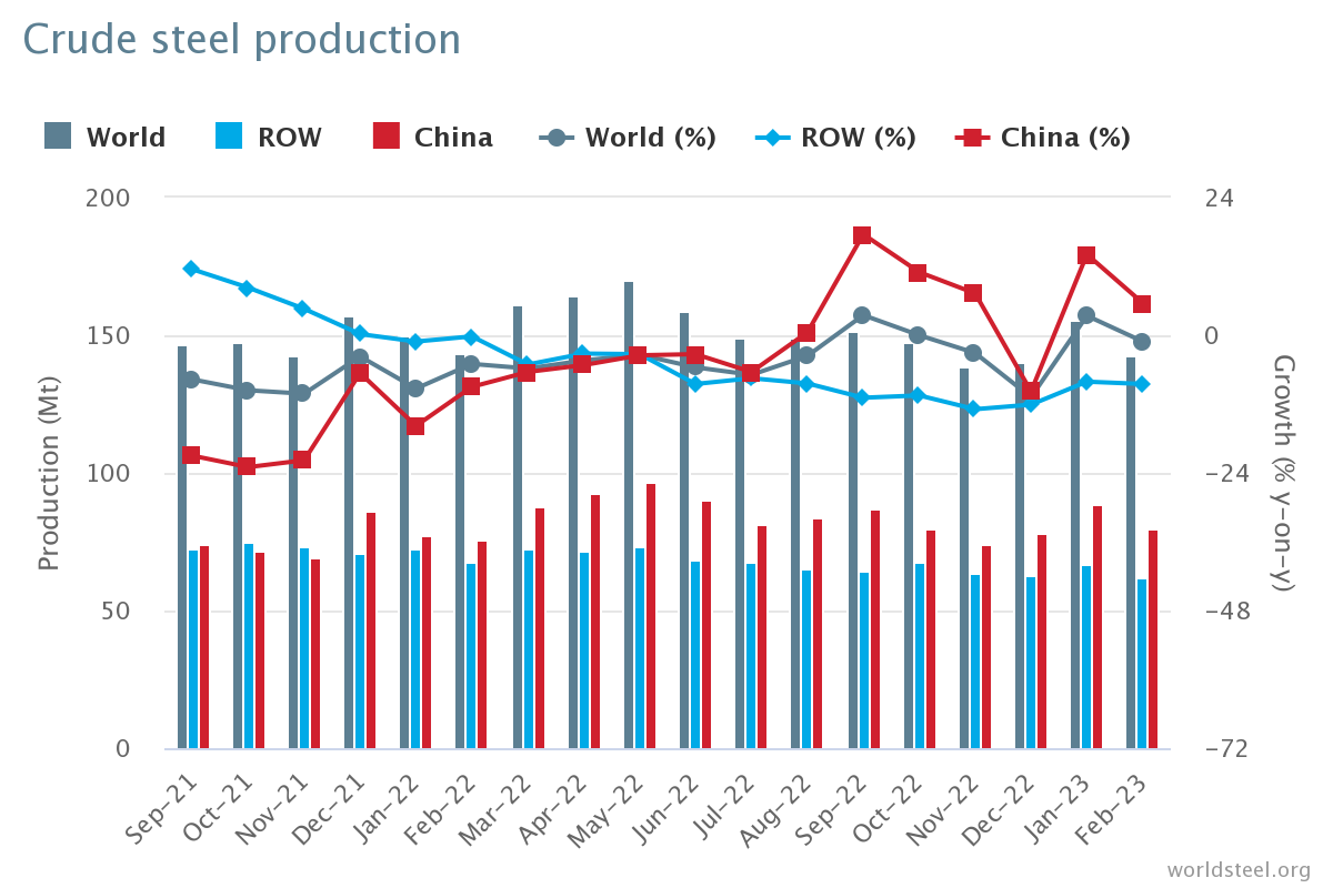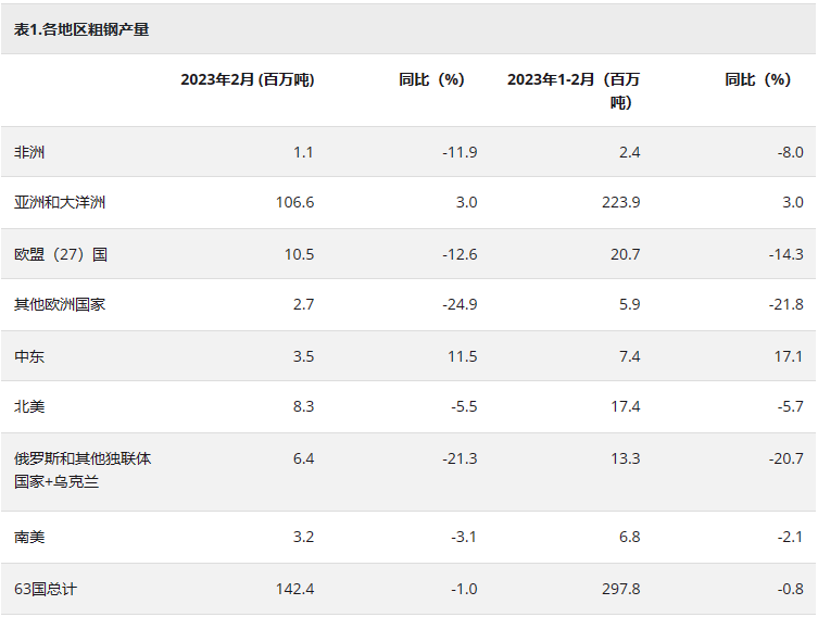 2023年2月全球63個納入世界鋼鐵協會統計國家的粗鋼產量為1.424億噸,同比下降1.0%。