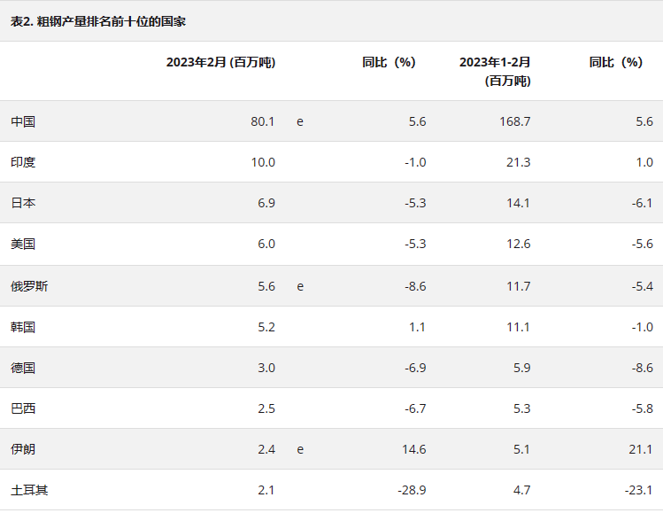 2023年2月,中國粗鋼預估產量為8006萬噸,同比提高5.6%;印度粗鋼產量為1000萬噸,同比下降1.0%;日本粗鋼產量為690萬噸,同比下降5.3%;美國粗鋼產量為600萬噸,同比下降5.3%;俄羅斯粗鋼預估產量為560萬噸,同比下降8.6%;韓國粗鋼產量為520萬噸,同比提高1.1%;德國粗鋼產量為300萬噸,同比下降6.9%;巴西粗鋼產量為250萬噸,同比下降6.7%;伊朗粗鋼預估產量為240萬噸,同比提高14.6%;土耳其粗鋼產量為210萬噸,同比下降28.9%。