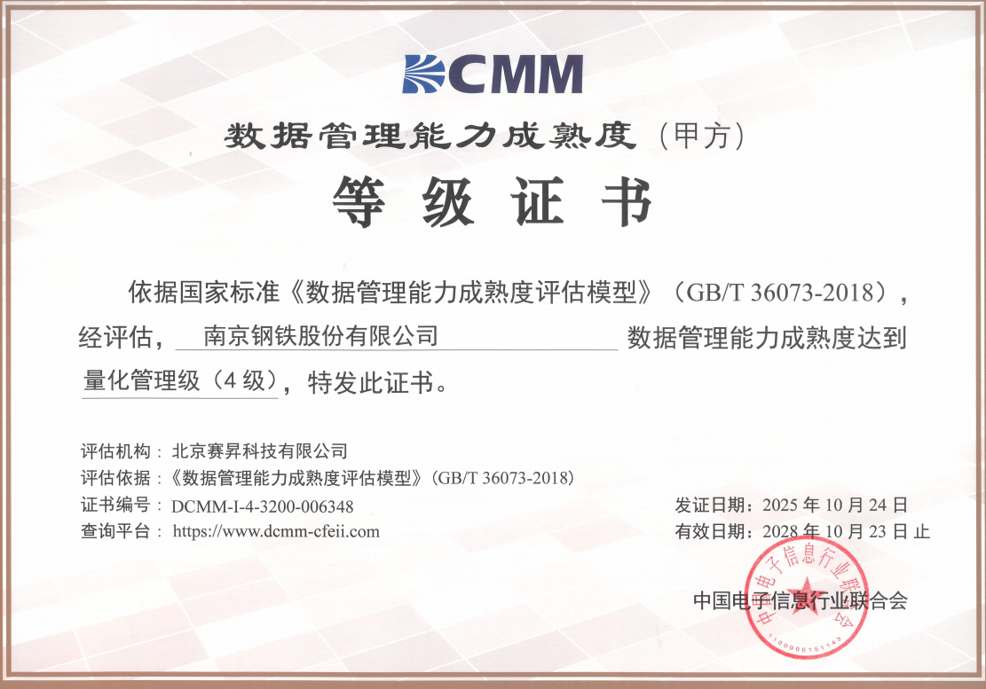 與此同時,中國電子信息聯合會公布最新一批獲得數據管理能力成熟度等級證書的單位名單,南鋼順利通過DCMM4級(量化管理級)認證。DCMM(數據管理能力成熟度模型)是我國首個數據管理領域的國家標準,也是衡量企業數據管理能力的權威標尺。南鋼通過認證,表明企業已建立全生命周期的數據管理體系,能夠通過量化指標持續優化數據管理過程,實現數據驅動的精細化管理。