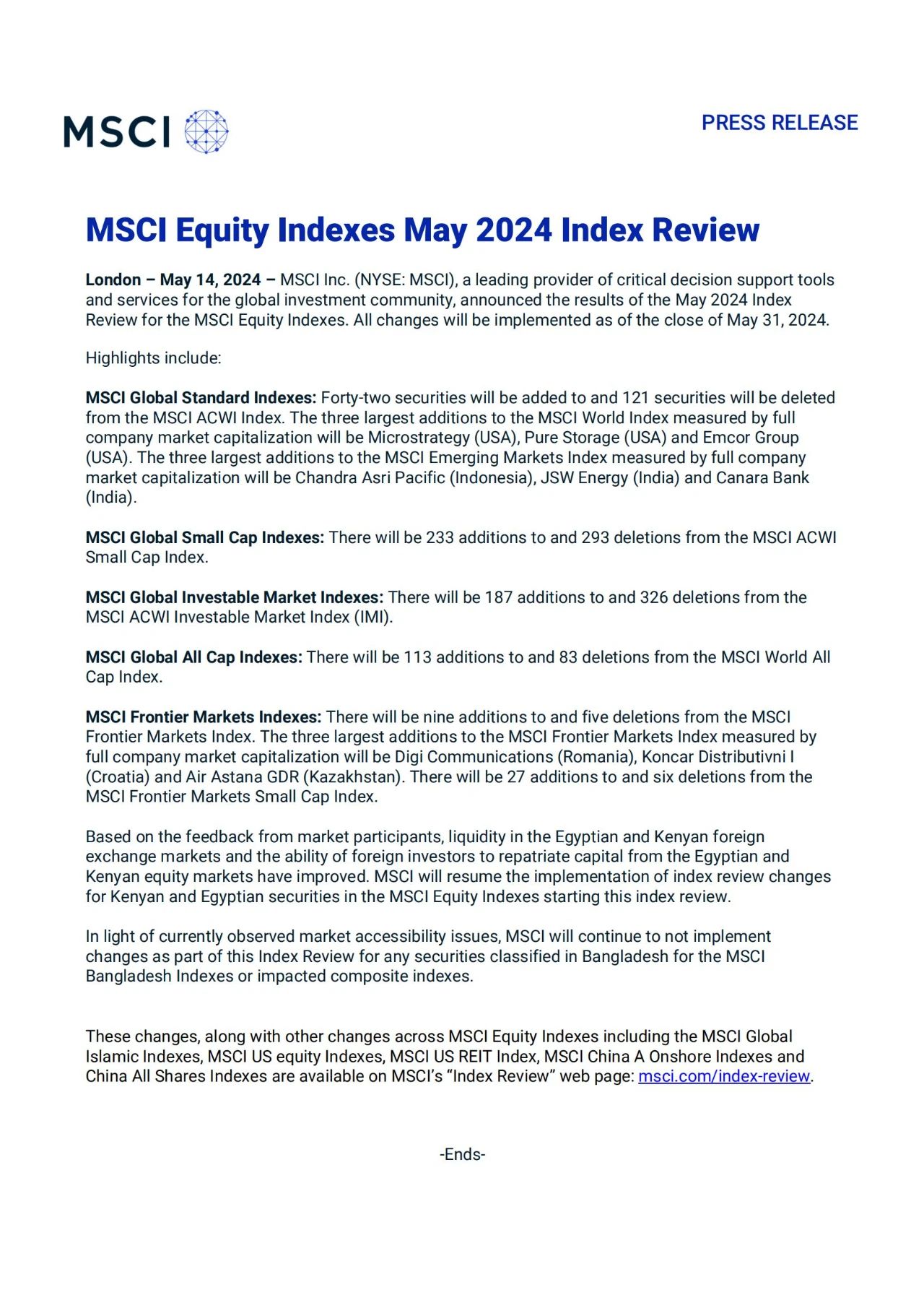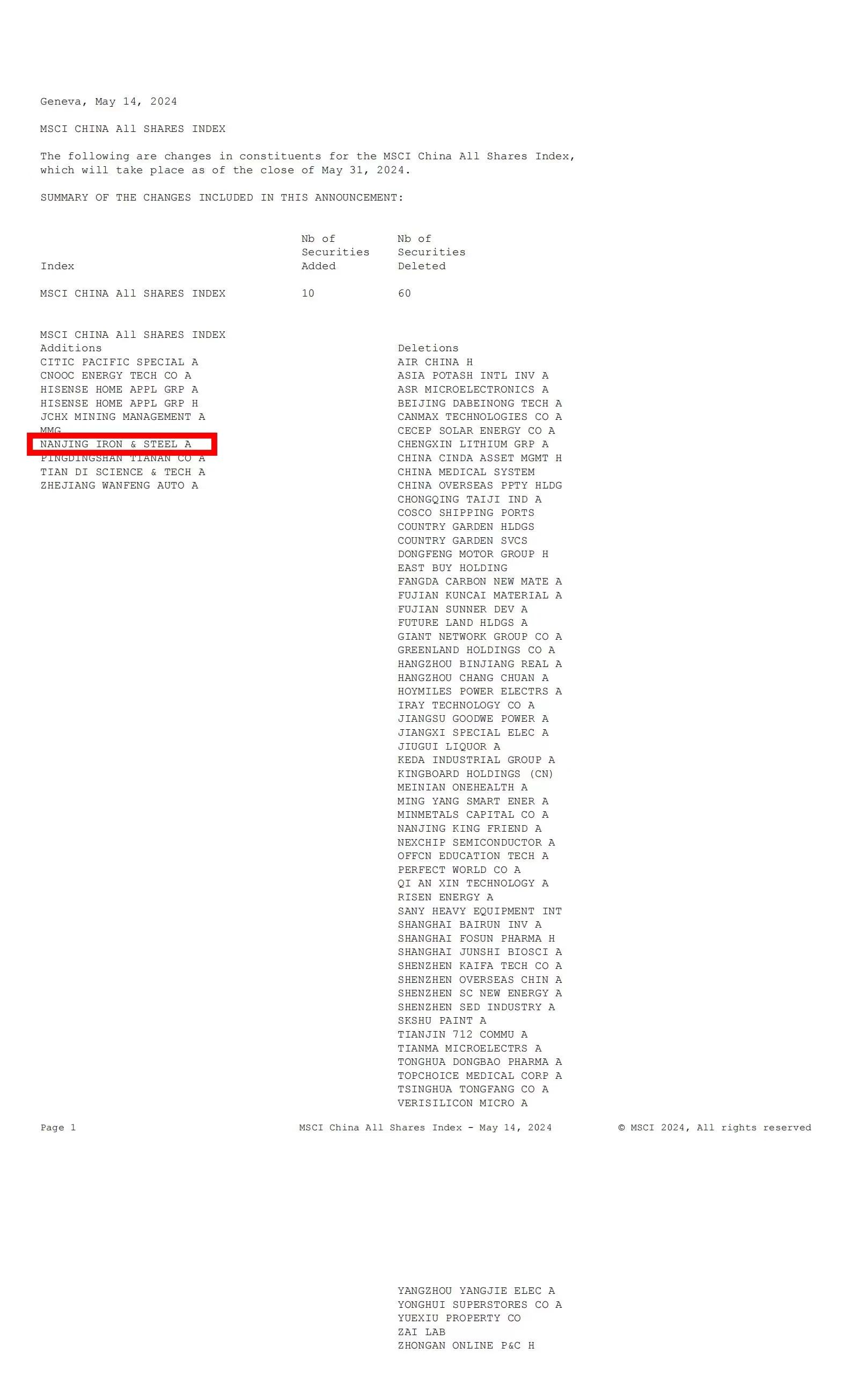 5月15日,國際指數編制公司MSCI公布了其2024年5月的指數調整結果,本次調整結果將于2024年5月31日收盤后生效。此次MSCI指數調整新增8只A股股票名單中,南鋼股份名列其中。