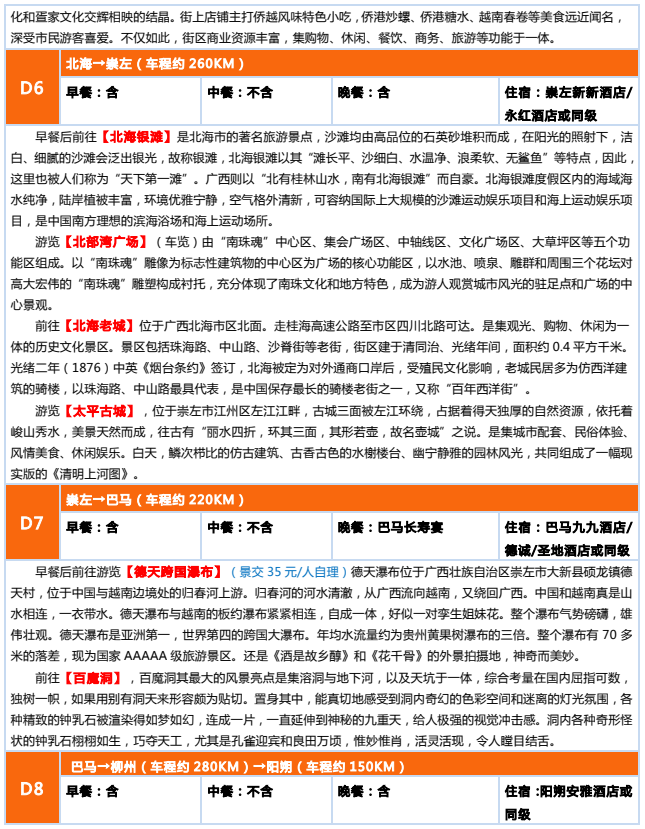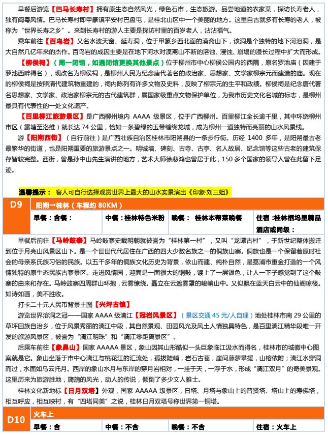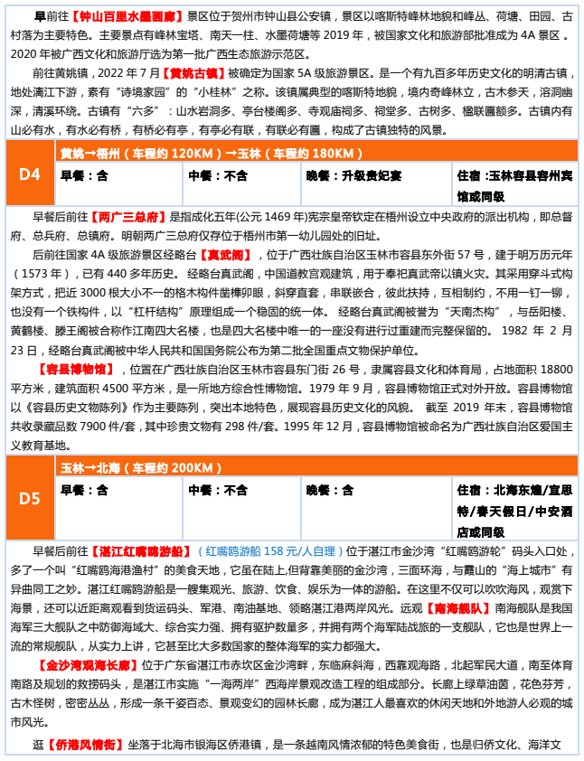 ??精華景點(diǎn):鐘山百里水墨畫(huà)廊/黃桃古鎮(zhèn)/兩廣三總府/真武閣/容縣博物館/湛江紅嘴鷗游船/南海艦隊(duì)/北海銀灘/德天大瀑布/白魔洞/巴馬長(zhǎng)壽村/興平古鎮(zhèn)/冠巖風(fēng)景區(qū)/象鼻山/日月雙塔等等...
